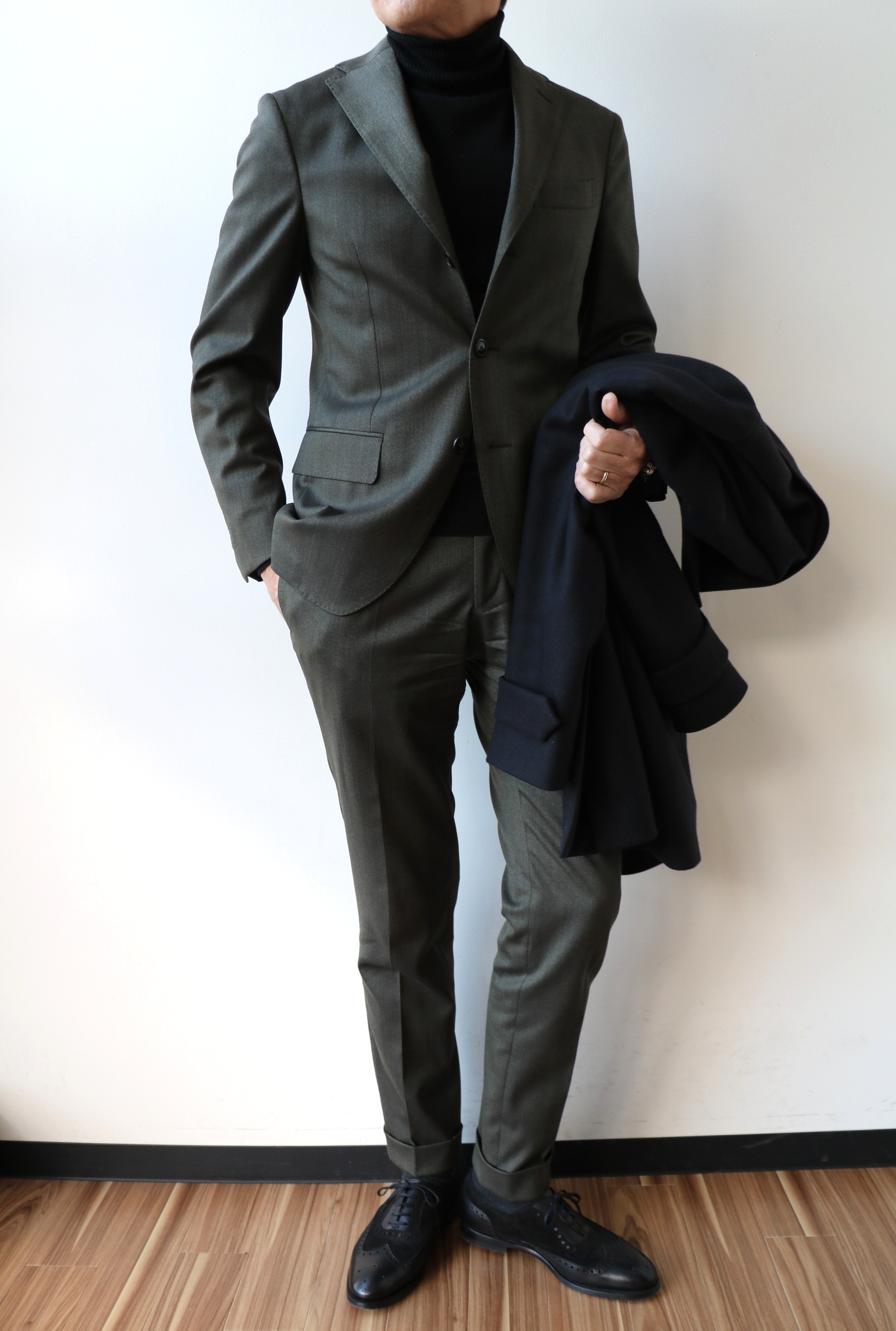 直し屋さんから出来上がってきたばかりのDe Petrillo(デ ペトリロ)のスーツ。同じウール素材のギャバジンですが、こちらはストレッチが効いていません。サイズ46を選び、貫禄のクラシックフォルム。フラのおかげで、肩周りに筋肉が付いたのが功を奏したのでしょう。以前なら前肩部分にシワができたのですが、今はジャストサイズです。