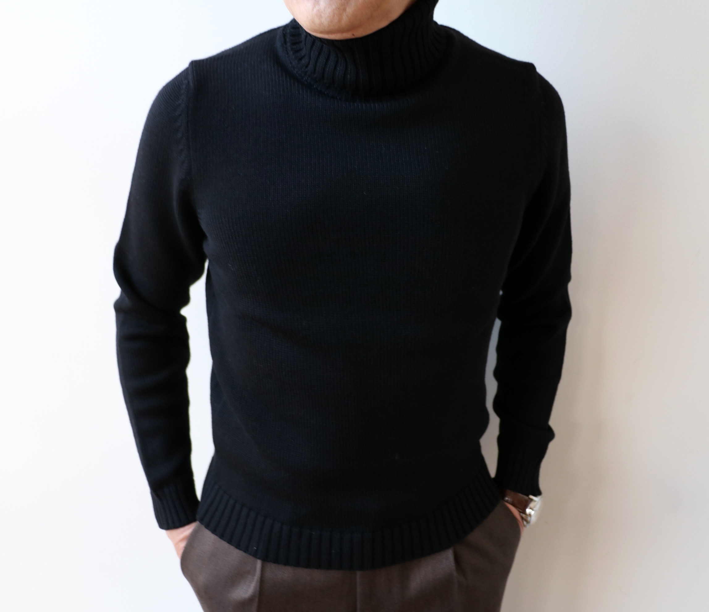 幸い、同じブラックで、ZANONE(ザノーネ)のミドルゲージを持っていました。ただ着て見ると、タイト。昨年まで46で着ていたのに...です。やはりフラ効果? これからは、48に上がるべきでしょうね。ただ上げてしまうと、ミドルゲージのニットは、スーツのインには窮屈です。やはり、同じJOHN SMRDLEY(ジョン スメドレー)の24ゲージのタートルネックが理想でしょう。サイズSで選ぶことにしました。他に候補はないかと探していると、ありました。FILIPPO DE LAURENTIIS(フィリッポ デ ラウレンティス)のウール・シルク・カシミア タートルネック。ちょうど、ブラックの46があります。昨年、ネイビーを購入。肌に優しい、着心地の良いニットです。こうなると、別にブラックでなくても...なんて、優柔不断な気持ちになってきます。ボルドーで華やかに、オフホワイトで静寂さを装うのもいいかもです。