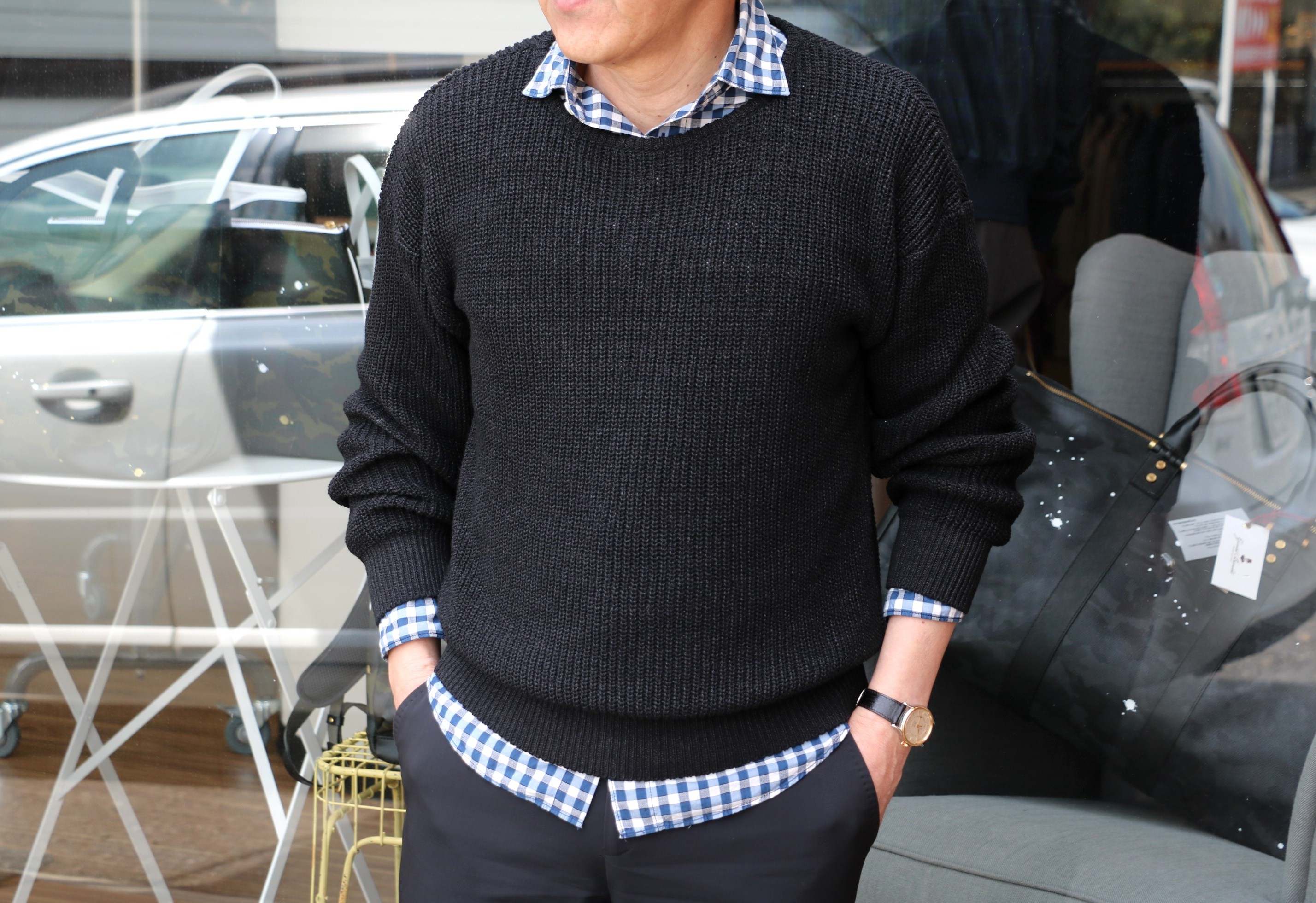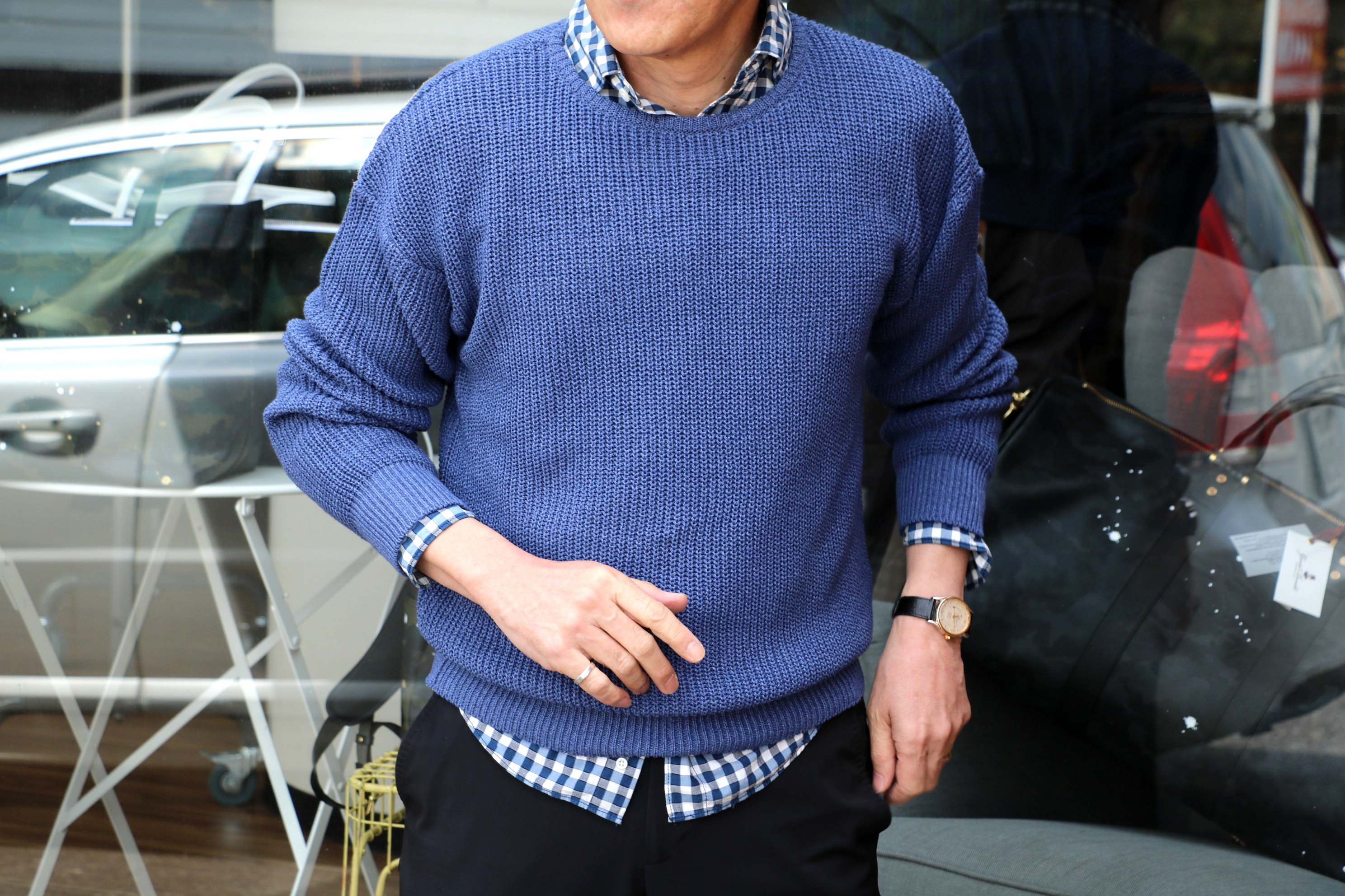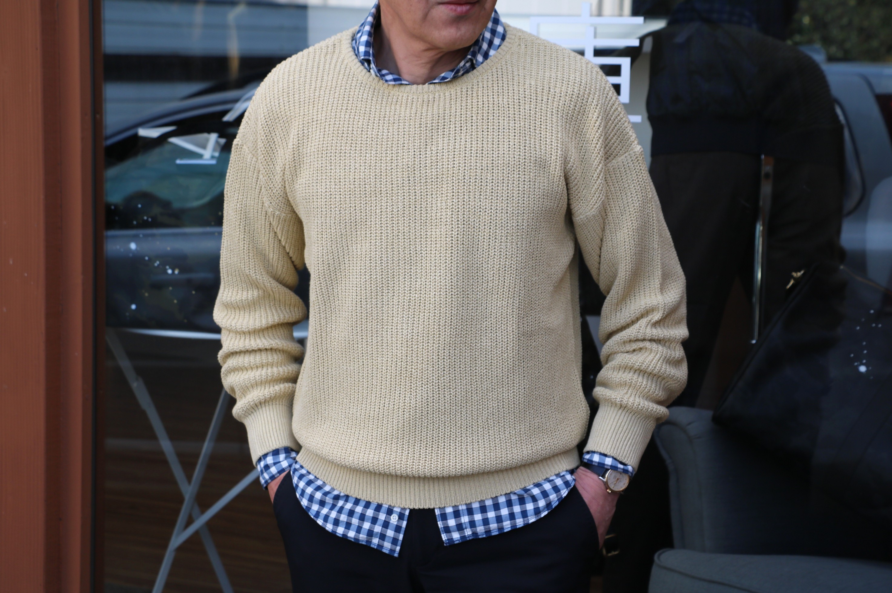 寒の戻りで、着方を変えてみました。いくらロングスリーブとはいえ、Tシャツの上に一枚では寒すぎます。それに「またそれ~」なんて思われるのも癪。下着を偲ばせ、チェック柄のシャツを合わせてみました。中に着たのは、2年ほど前に購入したバグッタ。着丈は長めで、本来ならパンツに収めるシャツ。でも裾が出過ぎないのは、ニットの裾のきつめのリブのおかげなんです。ちょうど良い所で、シャツを抑えてくれる為、だらしなくならない大人のシャツ出しスタイルが完成しました。月曜日にご来店されたスタイリストのN様(女性です)にも褒めていただき、調子に乗っております。