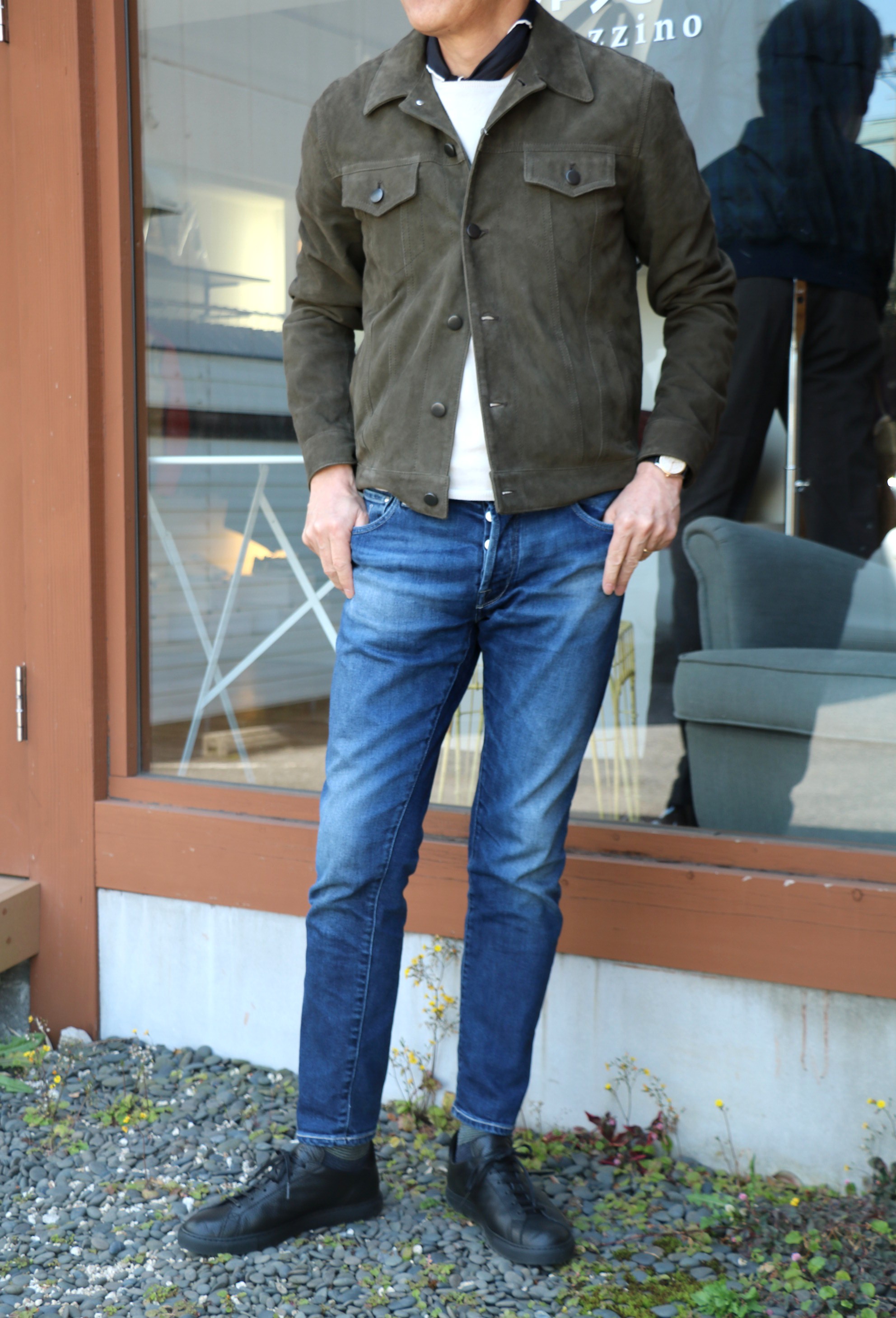 本日の出で立ちに羽織ったのは、SILENCE(サイレンス)のレザーブルゾン。実は、10年ほど前に購入した、よく似たレザーブルゾンを着ているので、私を見かけた方は、これが私物と言っても分からないかもしれません。本日、自慢したかったのは、初めて手に入れたブラックのスニーカー(C.QP)。柔軟なバイニングはしても、意外にコンサバ。食わず嫌いの多い私ですが、これからはチャレンジ。人生は、さほど長くはありません。ホワイトばかりのスニーカーが並ぶシューボックスに遂にブラックが仲間入りです。今日で2回目ですが、履き心地のよさはもちろん、今時の気分になります。そうなると気になるのが、Pantofora d'Oro(パントフォラドーロ)のイントレチャートスリッポンスニーカー。値段はしますが、ラグジュアリーです。ただその前に、スニーカーを持っていないナグラさんに勧めるのが先かもしれません。