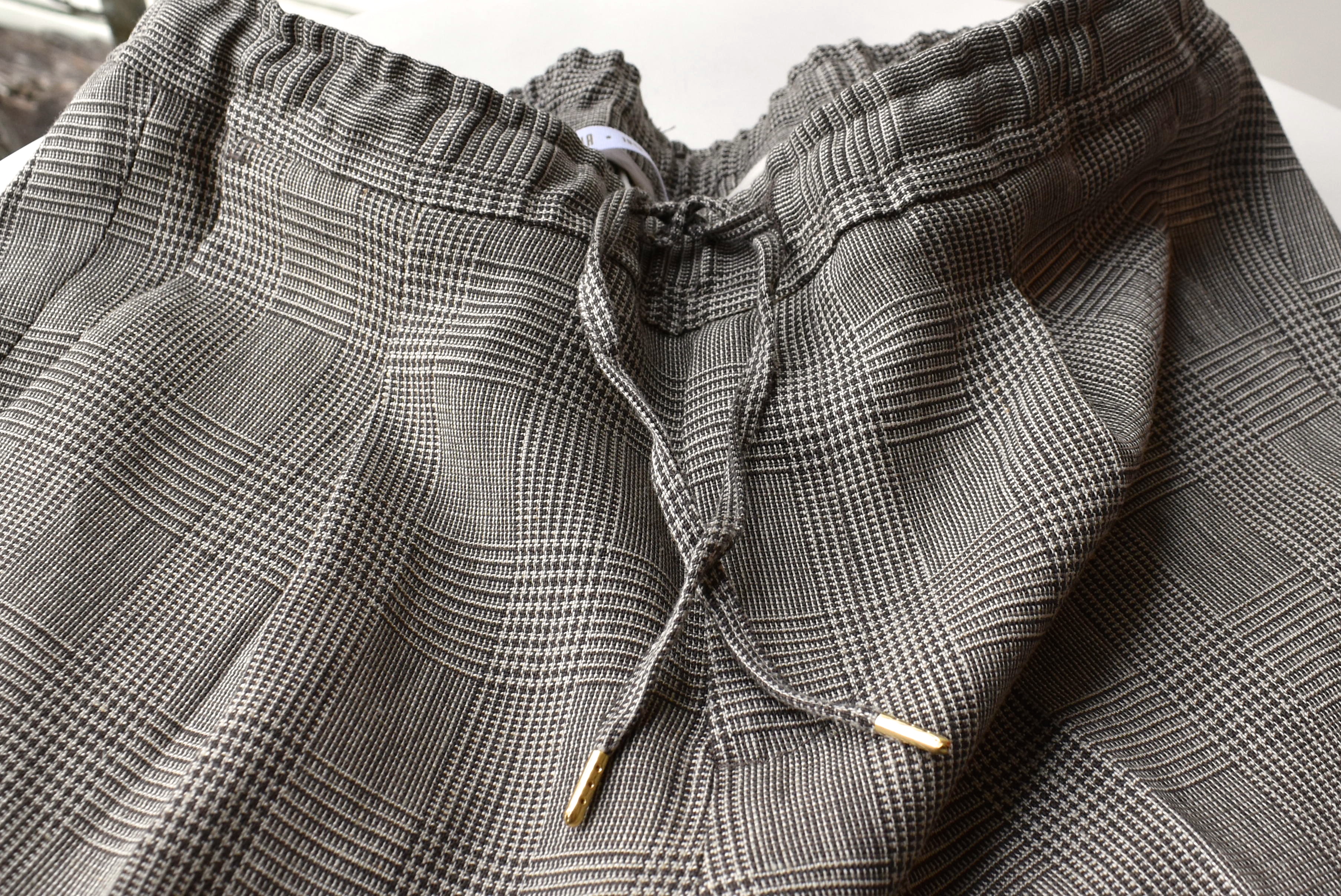 ブラックほどきつくはないオリーブグレイと生成りのグレンチェック柄。リネン100%です。英国調の柄行きだけに、今日のニットとの相性は抜群。生成りがかっているのも、ハートに刺さります。英国スタイルに憧れてた20代後半。独立をきっかけに乗り換えた車はローバーのワゴン(オースチン・モンテゴ)に趣味の車はMG-B。愛犬はウェスティ(ウエストハイランドホワイトテリア)、常にサスペンダーをして...なんて英国貴族趣味に走るほど、もう若くはありませんが、どこかに英国の香りを漂わせていたいのは、今も昔も同じです。