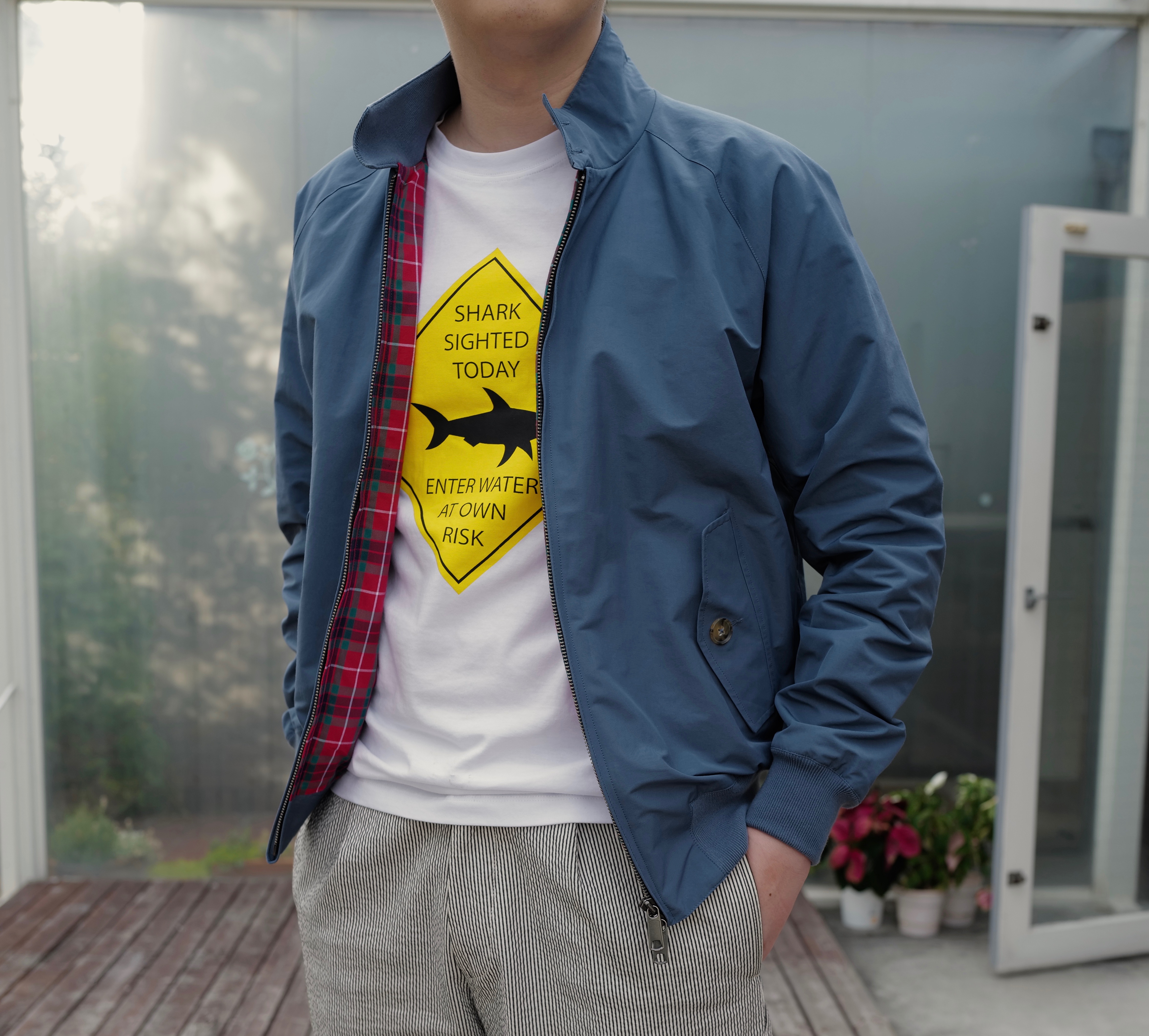 ベージュやブラウンと相性が良さそうなネイビーサメTシャツ。1番さりげなく遊び心を加味できる、合わせやすく分かる人には分かるデザインではないでしょうか。