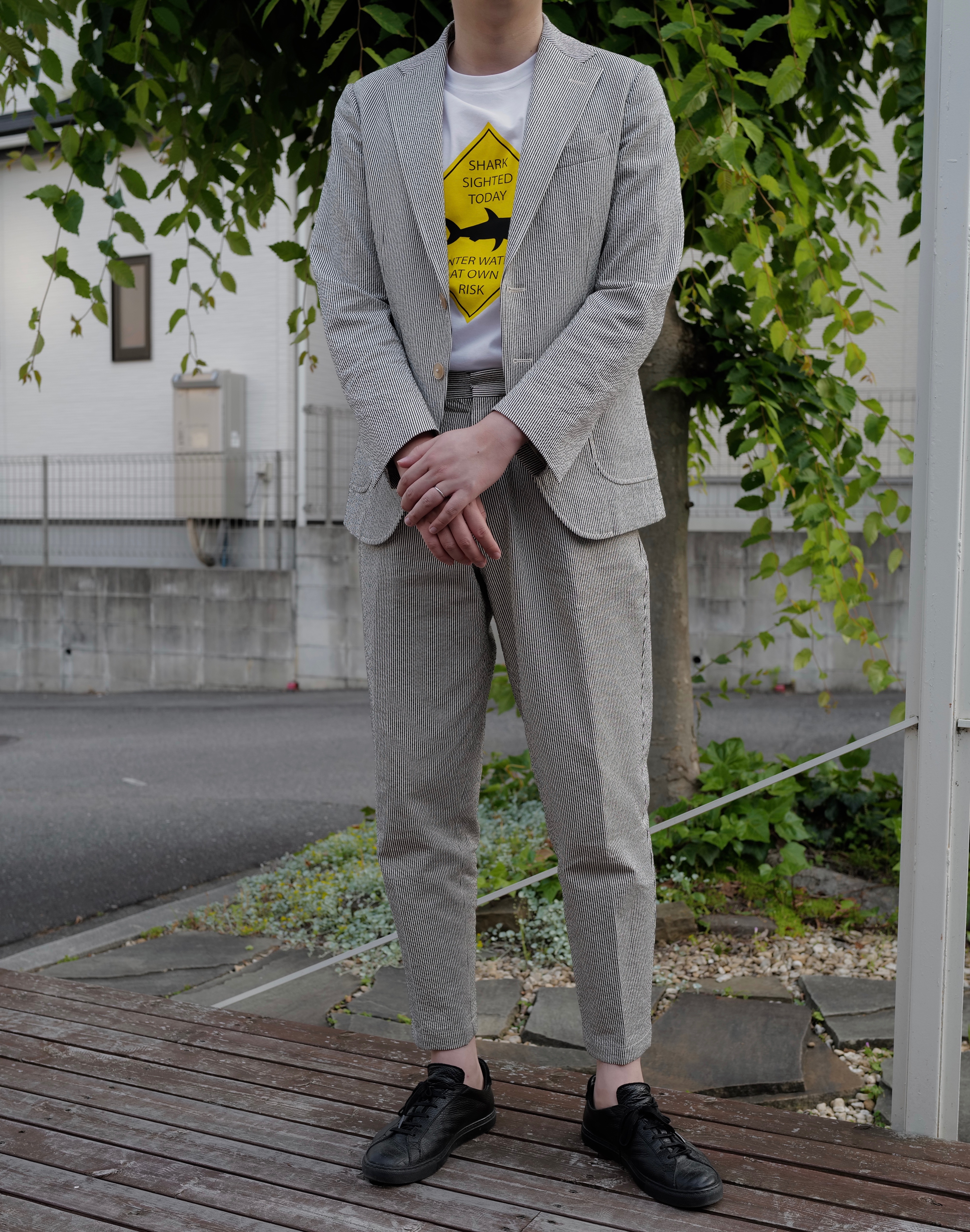 個人的に購入していたサメTシャツを、たまたま着ていたので写真を撮ってみました。シアサッカーのセットアップにロゴTシャツを合わせたラフなスタイル。フランスのマルセイユにいるイメージで組んでみました。しばらく海外には行けないですが、妄想しながらコーディネートを考えるのも楽しいですよ。