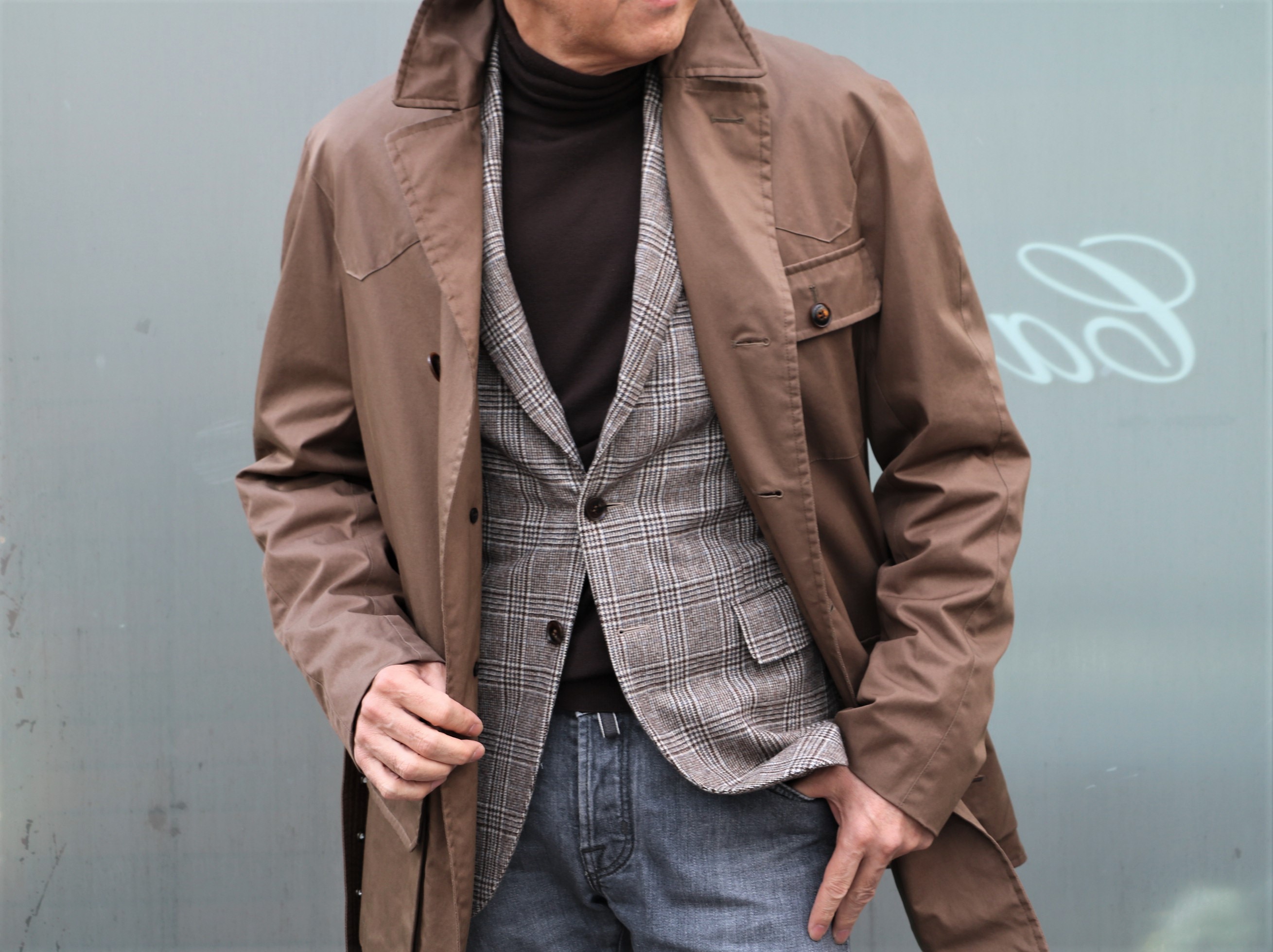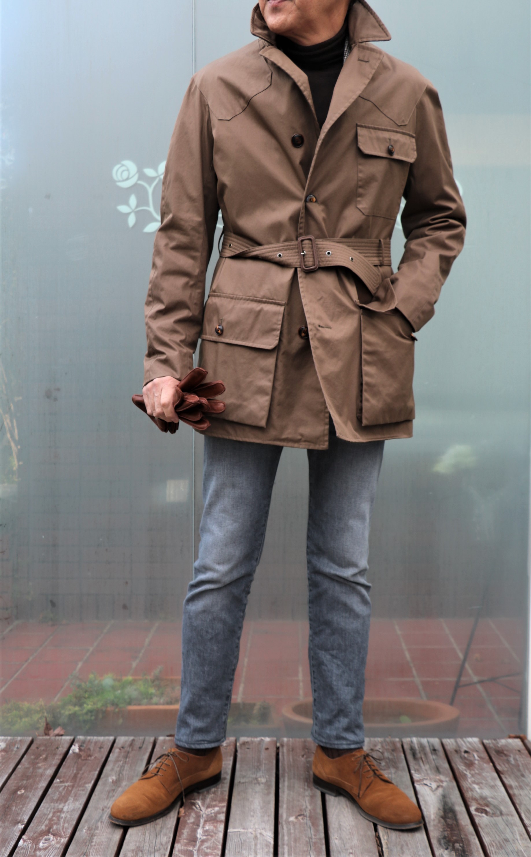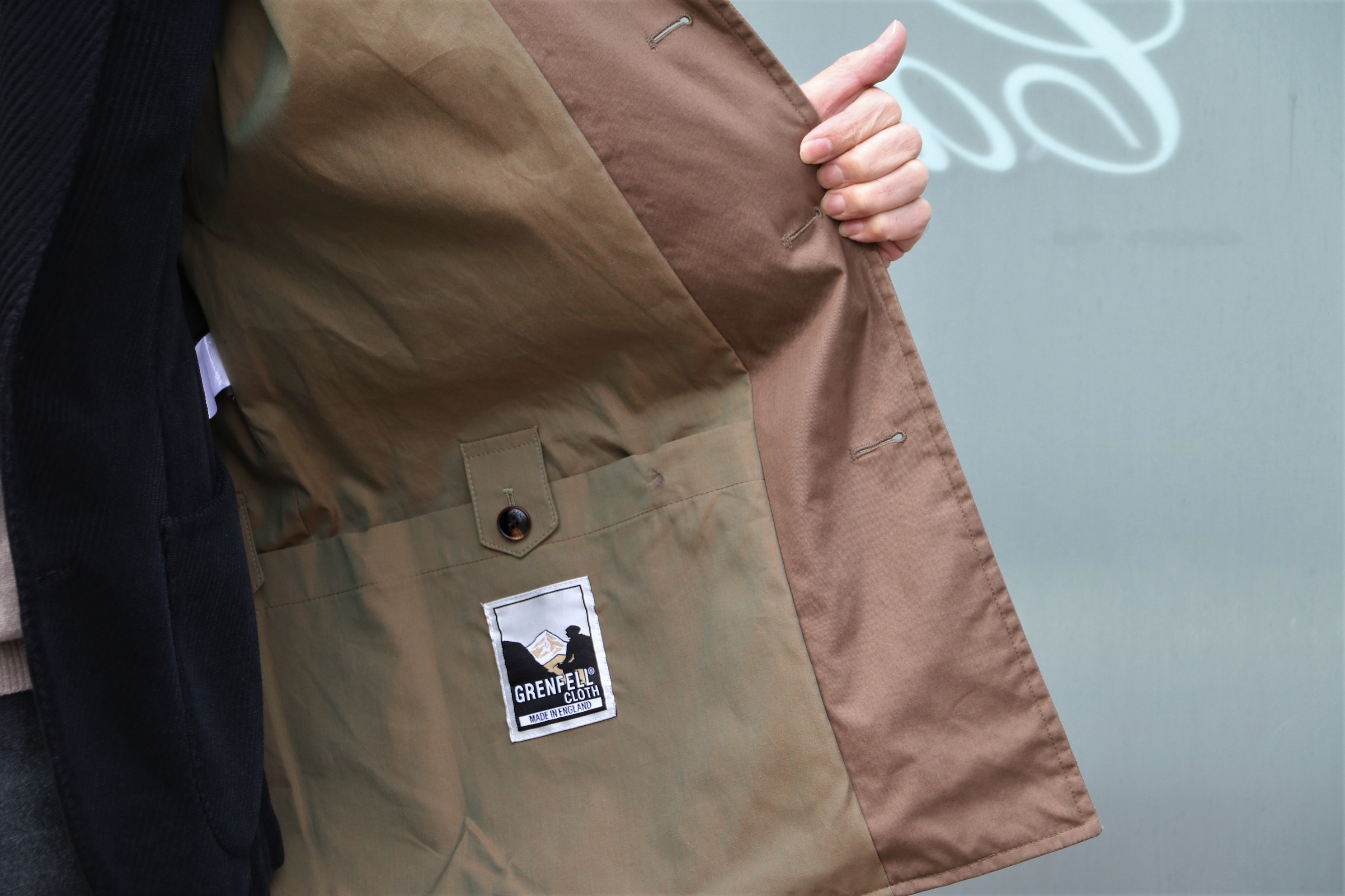 【GRENFELL/グレンフェル】のモデルの中でも珍しいウォッシュ加工のグレンフェルクロスを採用。赤味のあるブラウンとのハーモニーが絶妙です。そして個人的に魅力を感じるのが、ベルト。やや短めなベルトは無造作に結ぶより、一捻り(個人技)して収まる穴に入れてください。さりげなく外したとしても、ループで固定されているため、ずり落ちることはありません。