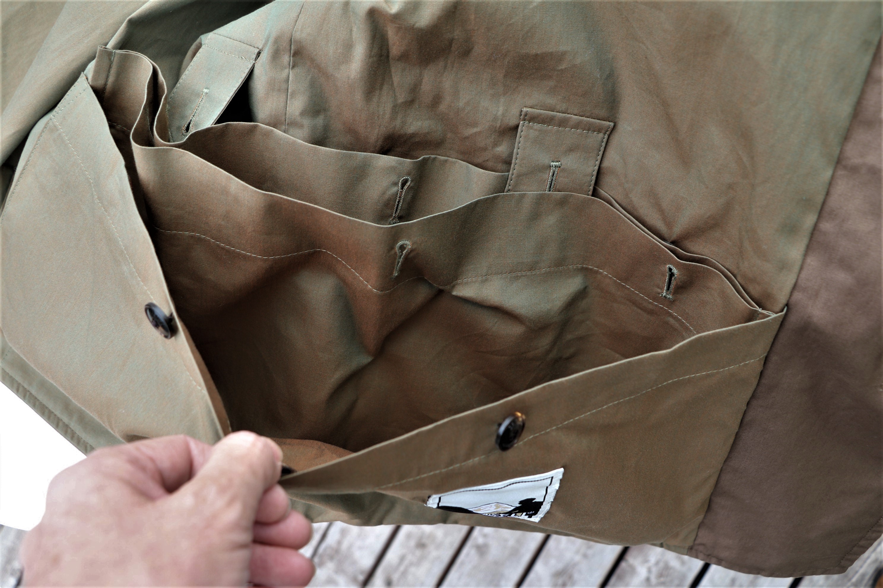 左側には捕らえた獲物を入れるためのゲームポケット。2か所のフラップ釦を開け、内側の6か所の釦を外すと、