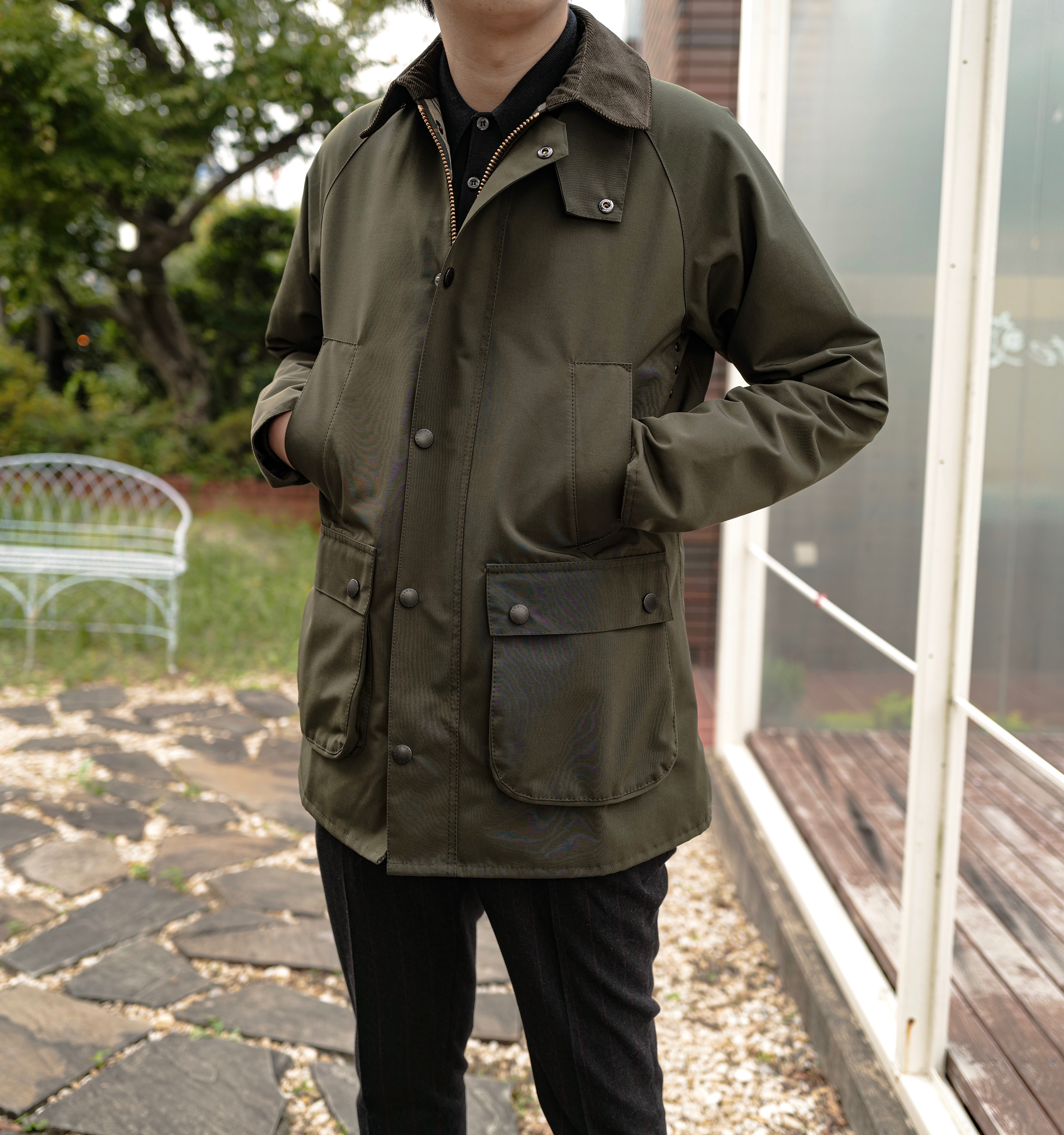 定番色として人気の高いSAGE(オリーブ)。ジャケットのデザインに馴染むいい色です。僕はネイビーを持っていますが、バブアーらしさ溢れるオリーブも絶対に欲しい1着です。オイルに負けないしっかりとした生地を採用してますが、羽織ってみるとめちゃくちゃ軽い着心地なので驚くと思います。