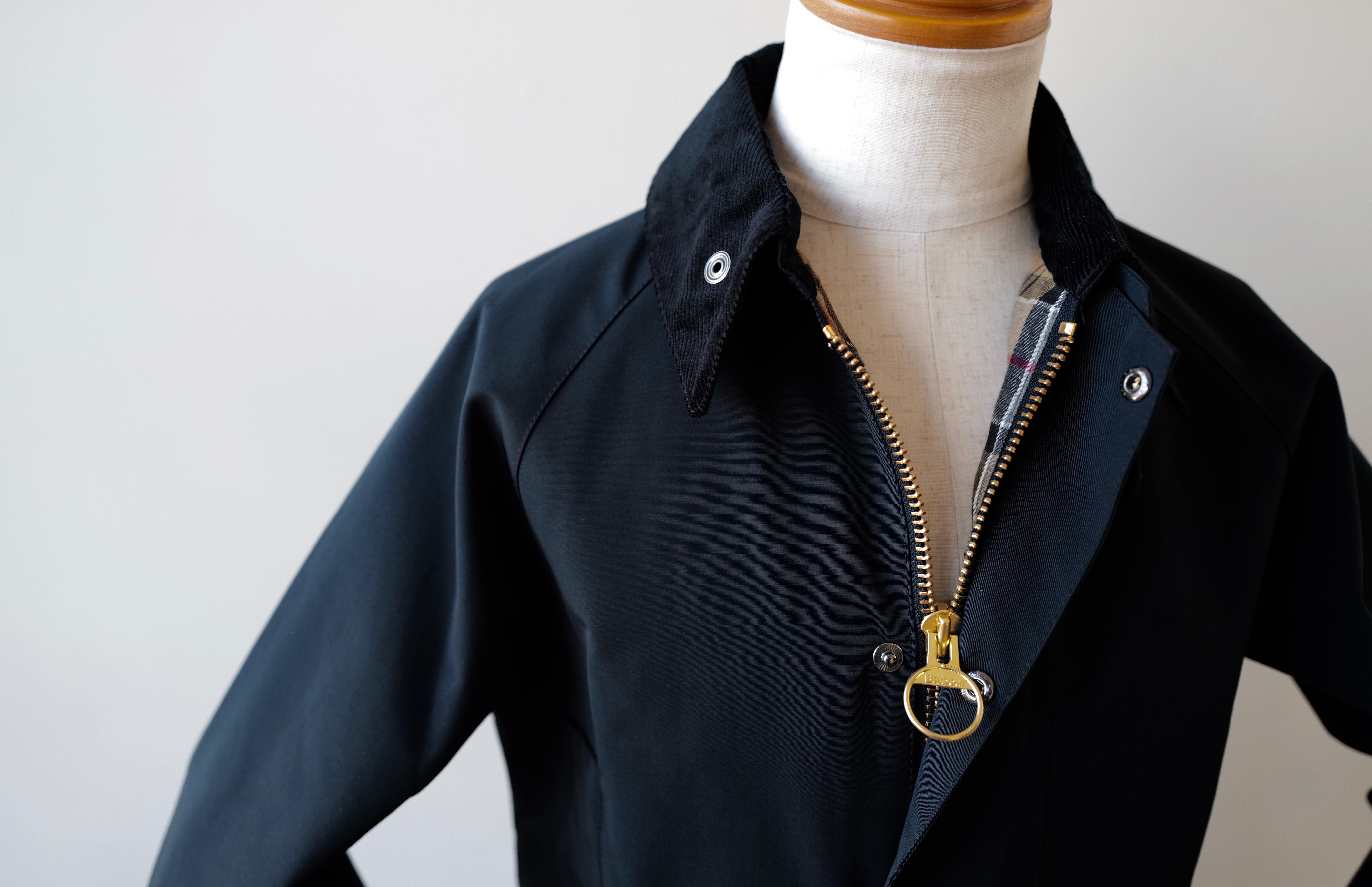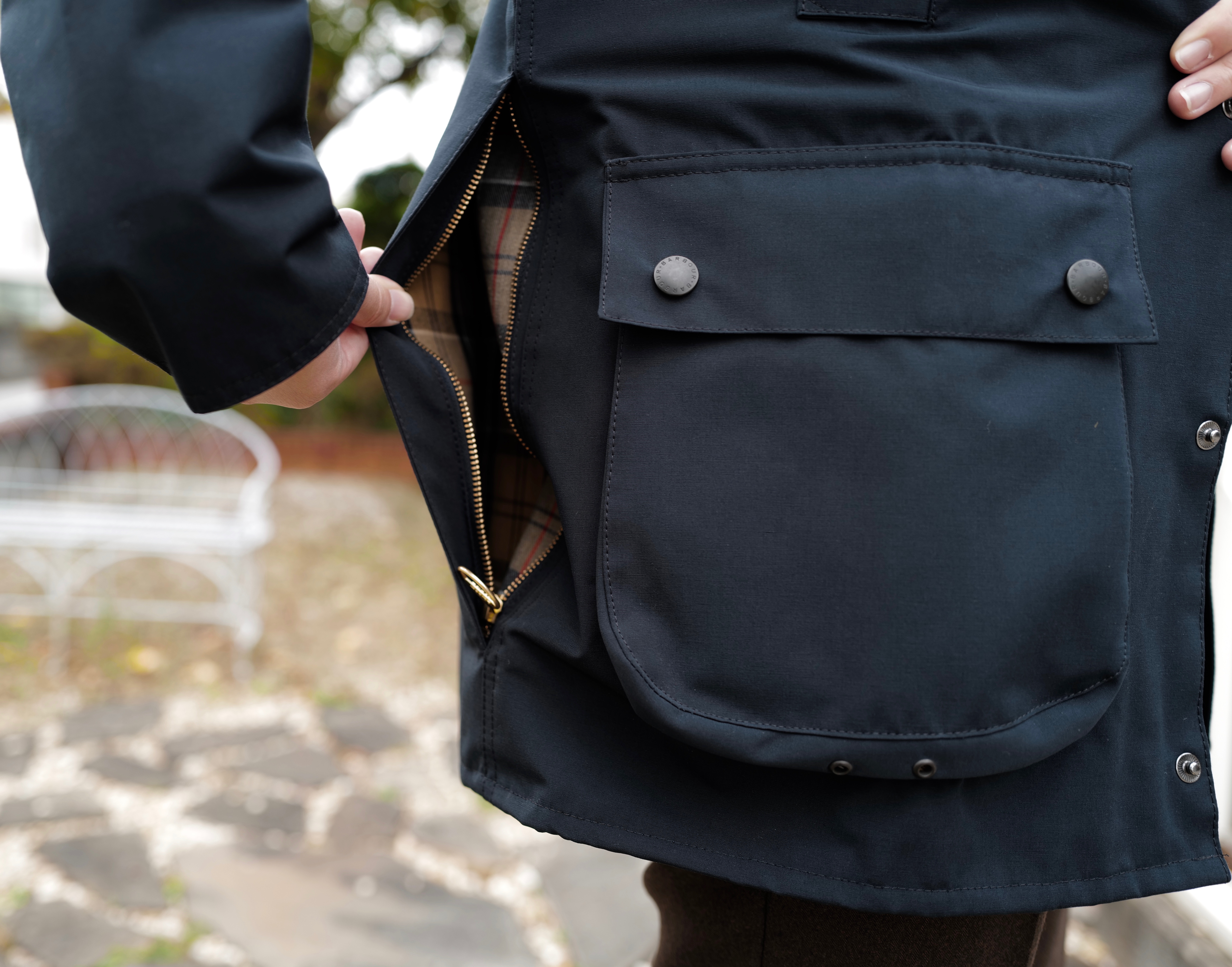グローブをはめていても開閉しやすいようにジップ部分がラウンドになっています。Barbour と刻印されたゴールドジップ格好良いですよね。(ネイビーはシルバージップになっております)実用的な部分が数多くあり、英国人や世界の服好きの方が好んで使われているのも納得です。