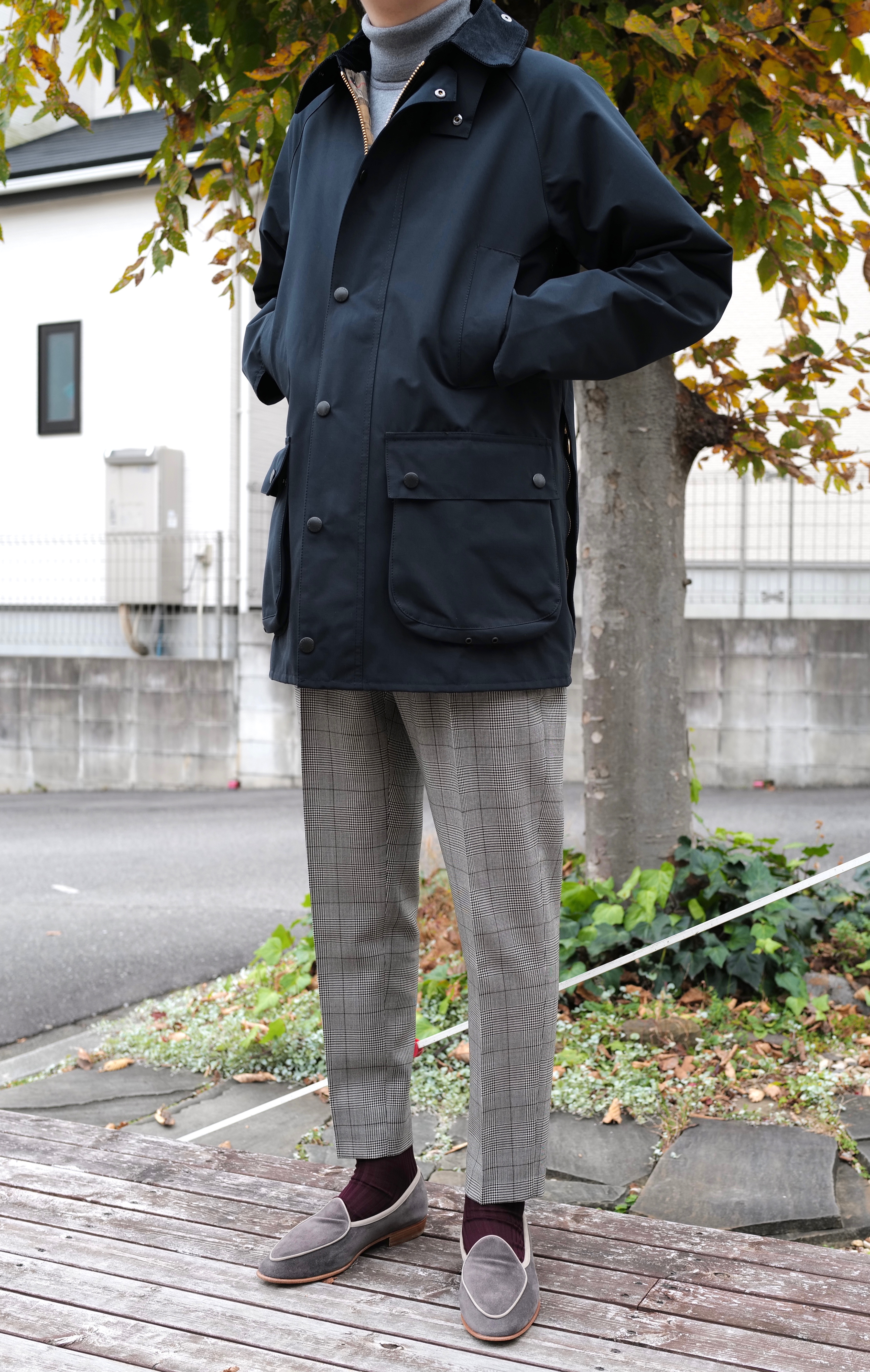 どこかのブログで書いたかもしれませんが、今季は寒色のグレイが気になっています。ネイビーやブラウン、ブラックのダークトーンのアウターを引き立たせてくれるので、冬は特に使い勝手が良いと思います。バブアーは武骨でレトロシックなイメージがありますが、ノンオイルモデルだと都会的な印象に映り、合わせ方もカジュアルからドレスまで幅広く対応出来そうです。
