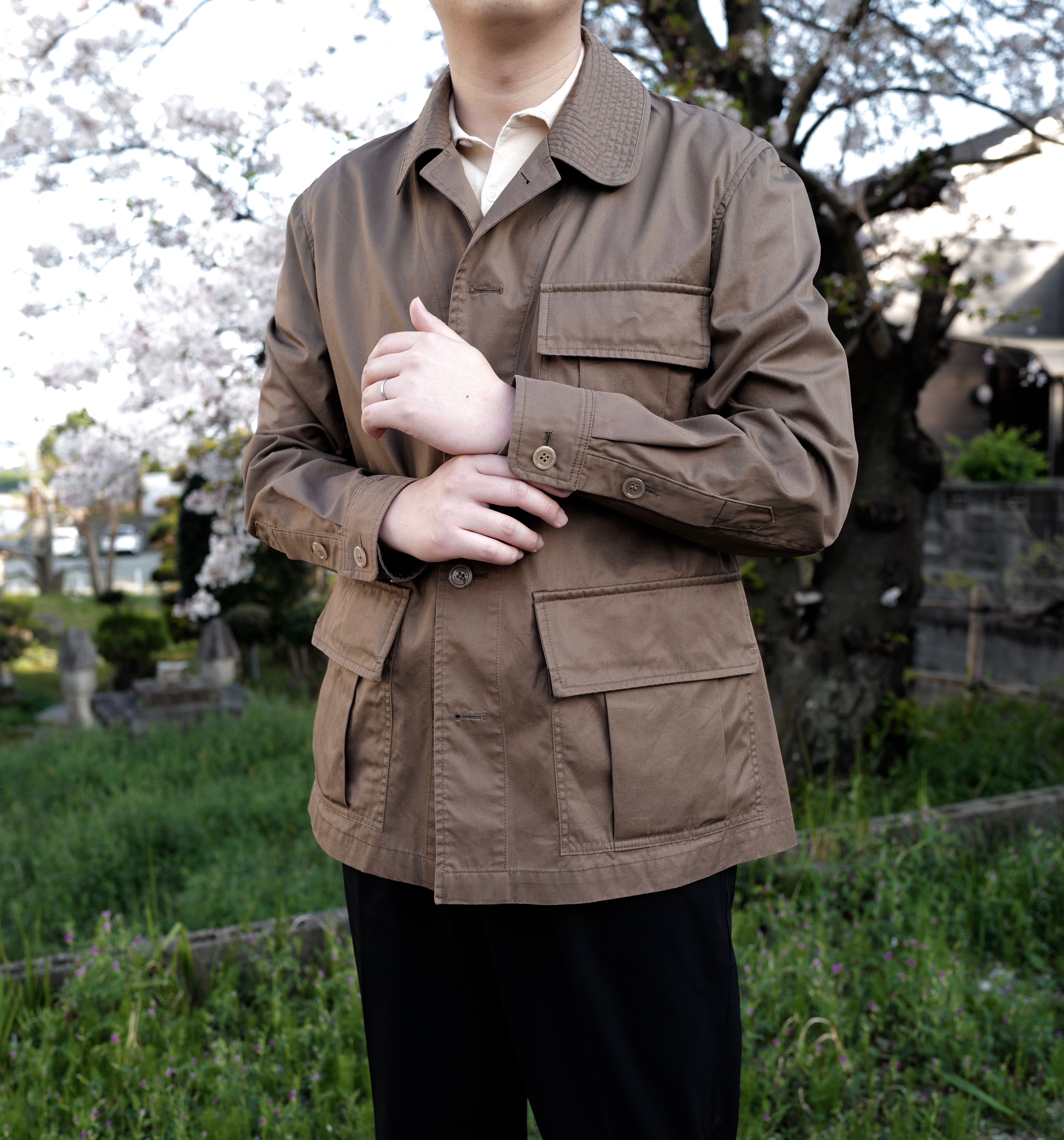 日に当たるとグレンフェルクロス特有の光沢が優美に映り、生地の滑らかさがつくりだすドレープも美しく魅力的。流行り廃りのない、オーバーでもタイトでもないサイズ感が長く愛用出来る理由の1つです。