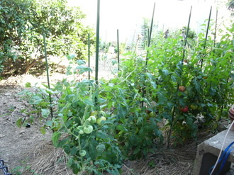 この場所は、ちょうど建物の影になっていて、一日のほとんど、日が当たりません。そして、風の抜け道になっていて、今日みたいに暑い日でも、とても涼しく爽やかです。少し前まで、青く小さかったトマトも、徐々に色付き始めています。冷房の嫌いな私は、事務仕事の合間にこの場所で寛いでいます。