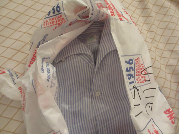 少しでも荷物を少なくと、今回初めてシャツをクリーニングに出してみました。イタリアでは、ジーンズはもちろん下着やソックスにまでアイロンをかけると聞いていましたので、今まで敬遠をしておりました。麻のシャツは洗いざらしが気持ちよいのですが、案の定、麻のシャツ4枚にきちんとプレスがかかった状態で戻ってまいりました。ただ不思議なのが3枚はハンガー、一枚はたたんで袋に入っています。なぜでしょうね。尋ねてみるほど、語学力に自信がありませんので、未だ解明されておりません。