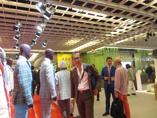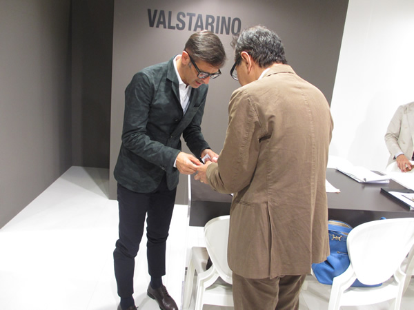 Valstar/ヴァルスターのブースで見つけたロイヤルブルーのハーフコートに満悦。社長のステファノ・マッサ氏もなかなかな洒落です。
