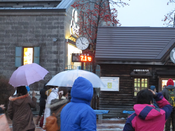 この日の小樽は、雨。時計の針を見ていただくと、午後4時5分前。辺りは薄暗くなってきます。温度表示を見ると、7.1度。風がないせいか、今日の岡崎よりも暖かく感じます。2年前の小樽が、