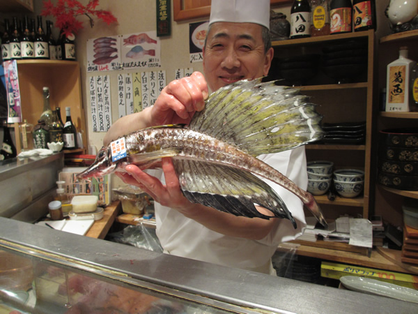 八角(トクビレ)を手にして、にっこり。この方が八田寿司の大将。2年ぶりの再会です。