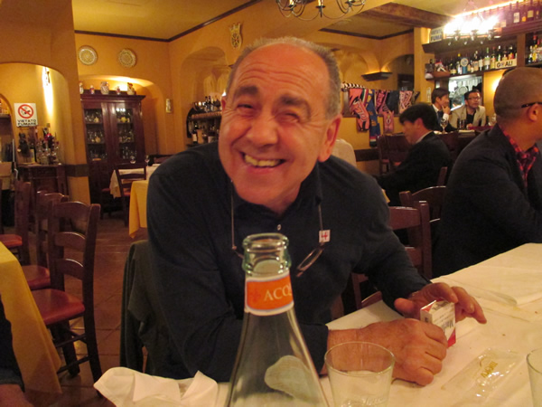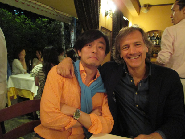 展示会後、食事にお誘いいただきました。場所は、青山にあるトラットリア”ドンチッチョ”。活気ある店内は、正にイタリア大衆食堂。まるでイタリアに来ているような、そんな雰囲気のあるお店です。一番奥(右)で手を上げているのは、フィナモレのオーナー、シモーネ氏と友人。その隣はジェイダブリューブラインのプロダクションマネージャー、ファヴィリッチ氏。左奥の二方はエストネーションのバイヤーさん。そして…