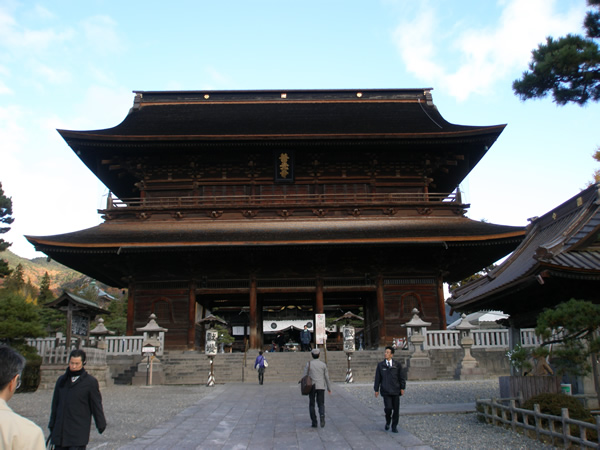 翌朝6時起床。7時から始まるホテルのバイキングで食事を済ませ、荷物をまとめてチェックアウト。9時の帰りの電車の時間まで善光寺に。昨日とは打って変わって、青空が広がり清々しい空気の中を歩くのは、とても気持ちの良いものです。まだ観光客の姿は無く、通勤の人や通学の学生さんたちに混じって石畳の境内に。仁王門をくぐり、駒返り橋を渡ると、重要文化財の山門があり、そこをくぐると本堂です。善光寺については、こちらを参考にしてください。http://www.zenkoji.jp/about/index.html