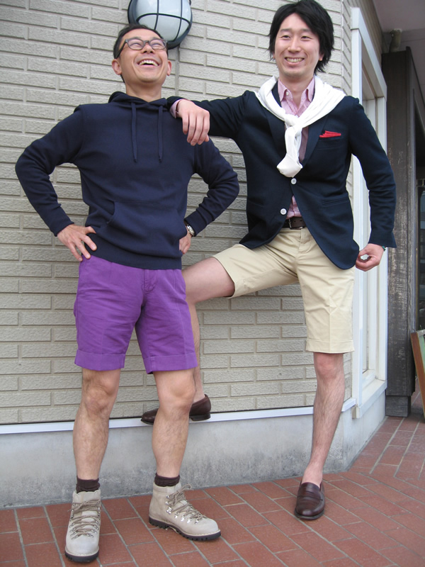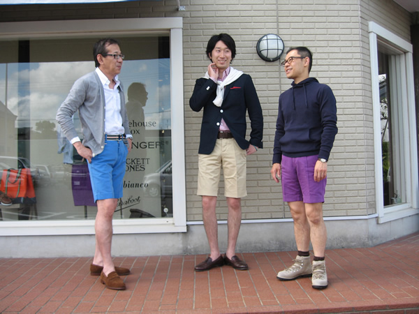 ゴールデンウイークも終わり、ここ竜美丘ガーデンプレイスは、昨日までの賑やかさとは打って変わって穏やかで静かです。祭りの後の静けさと、連休中の忙しさの疲れも出て、皆のテンションが上がりません。そこで、ゴールデンウイークにご紹介したショートパンツをスタッフ各々が穿いてみるという企画で盛り上がろうと、各自コーディネートしてみました。正直、皆、似合っていないのです。特に、私SUGURUが駄目です。ということで、NEWSに載せることを断念したのです。が、折角、カシェートからスタッフも呼んで撮ったワケですので、私のブログに載せることにしました。笑いは十分取れたはずです。笑えば、明るくなれるし、活気も出ます。さてさて、その効果は・・・・。