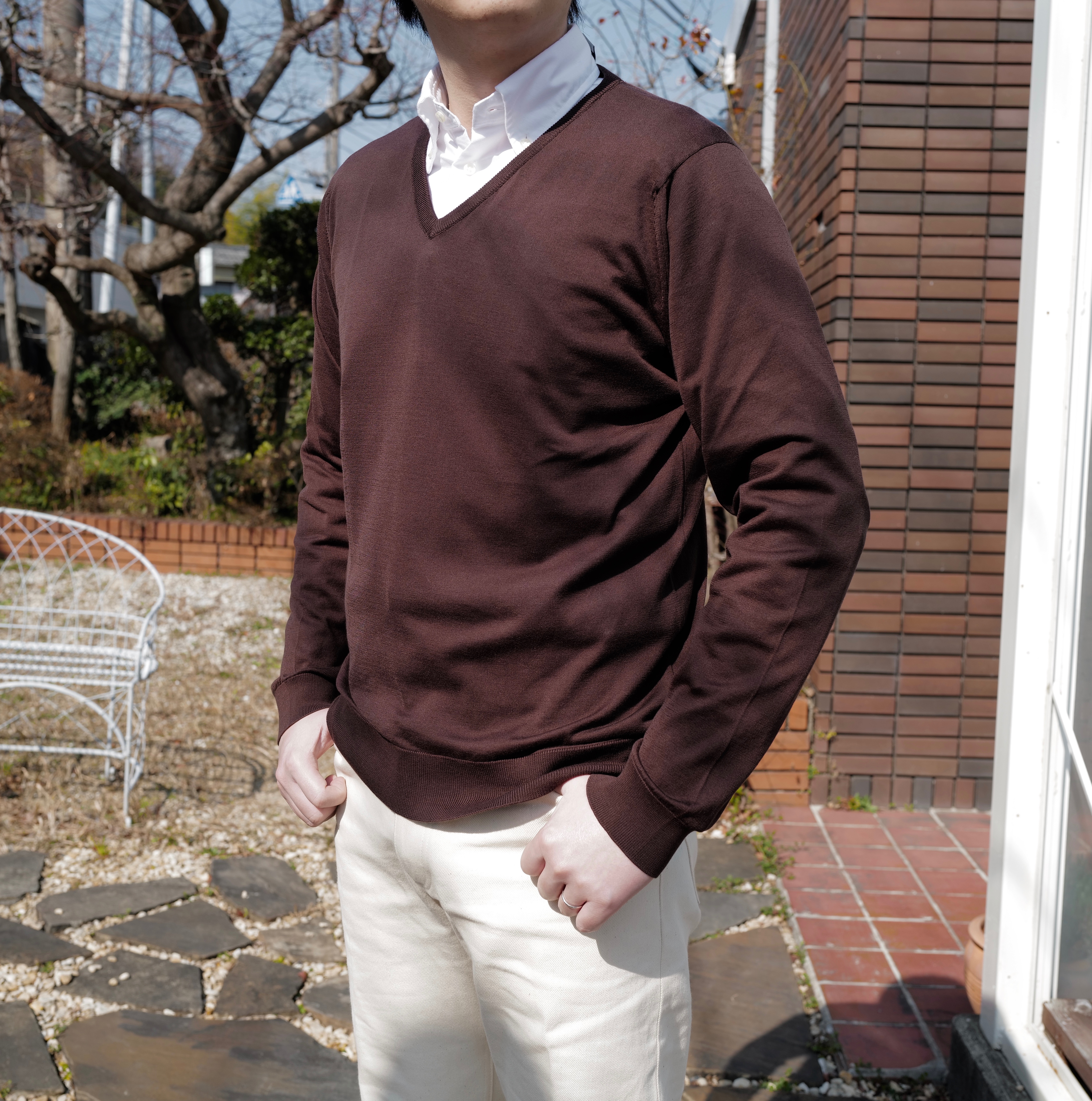 コットン素材は中にインナーを着ずに、1枚でラフに着用するのがお勧めです。持っていない方は、是非、ジョンスメドレーの肌触りの良さを肌で感じて頂きたいです。