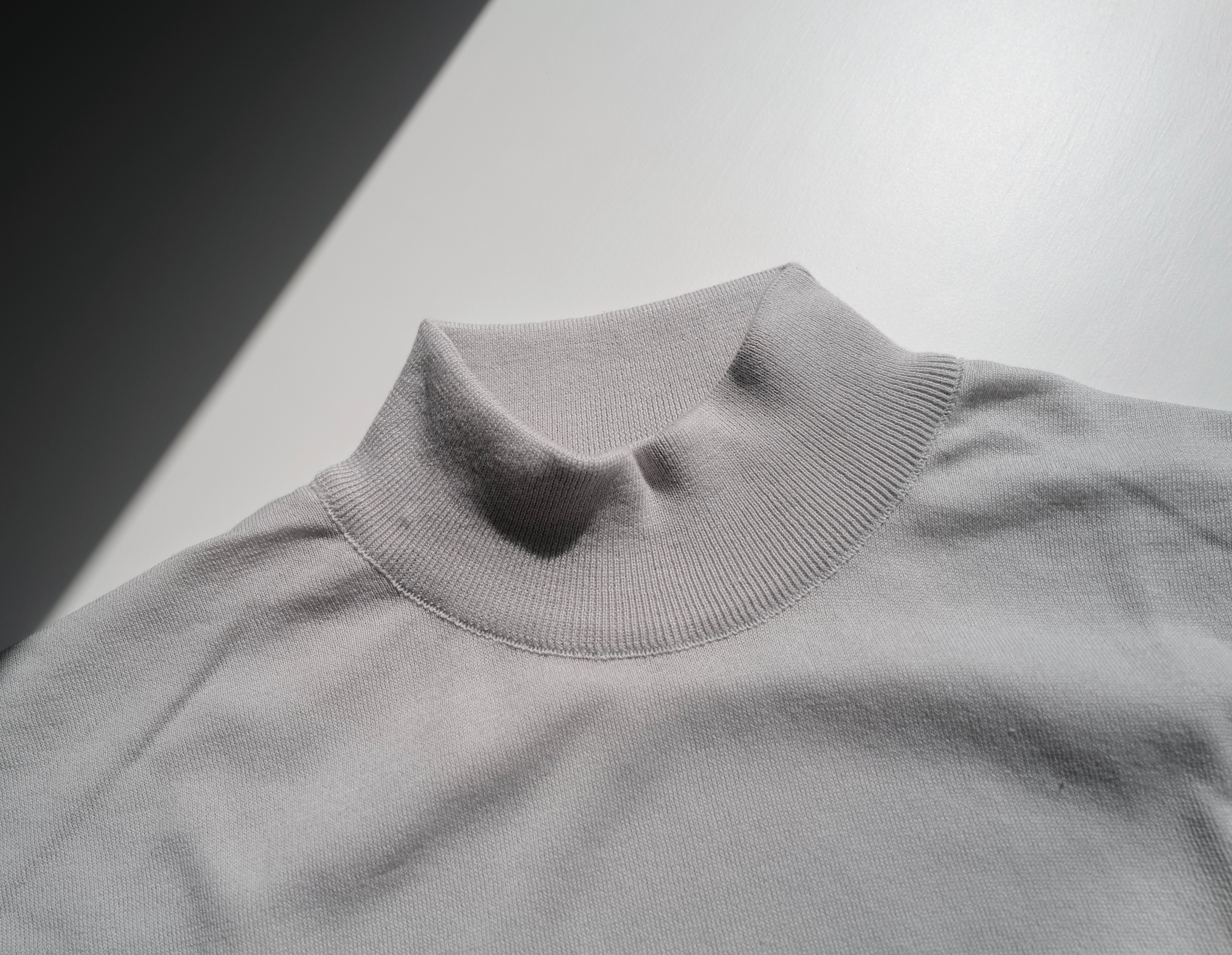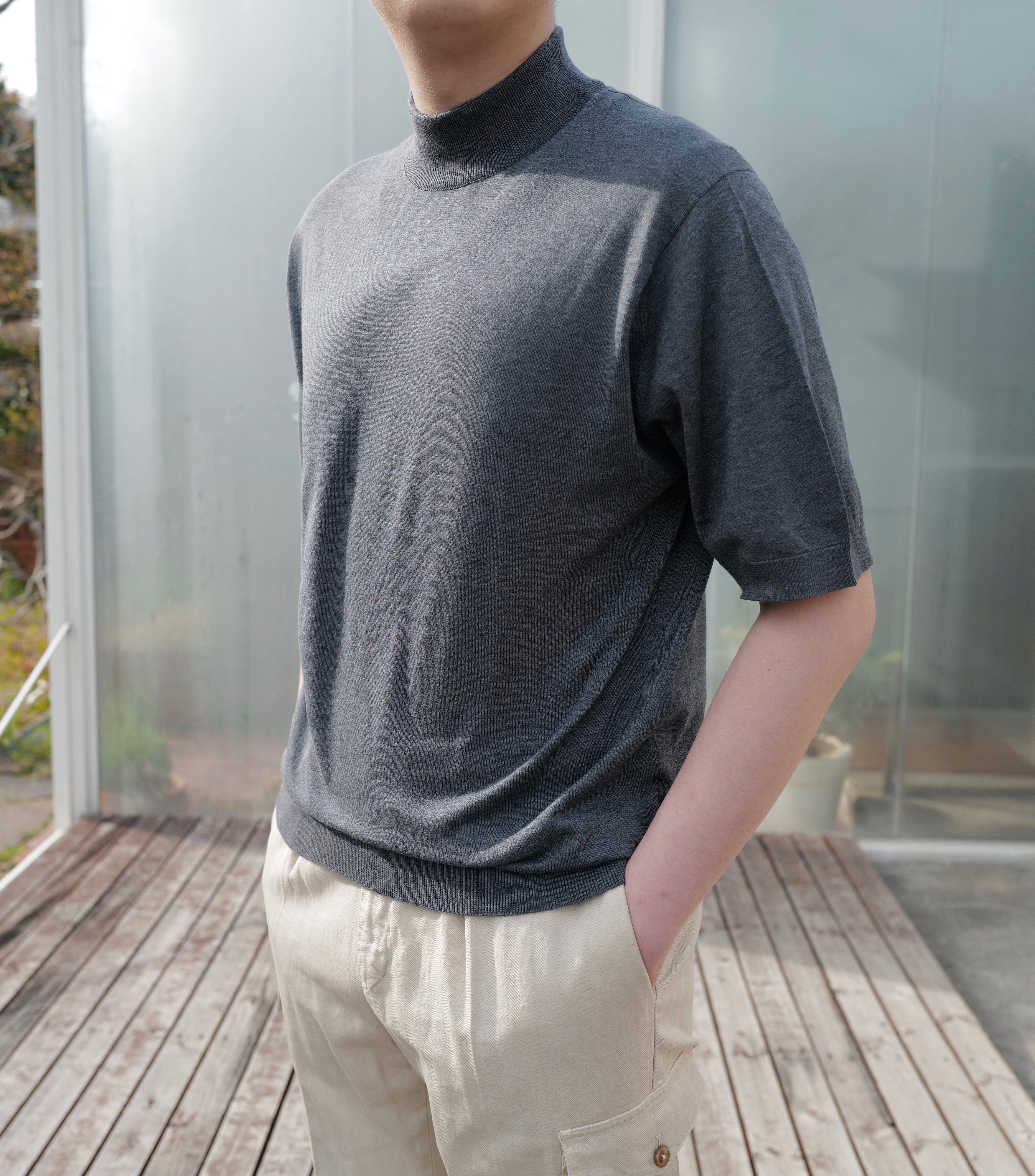 ご提案したいのは、【JOHN SMEDLEY/ジョンスメドレー】のモックネックショートスリーブニットになります。僕自身も1つ購入させて頂いているのですが、かなりの頻度で着用していました。自分が気に入っているのも大きいですが、頭に浮かんでこないような革新的なアイテムが案外使い勝手が良かったりするので、良さを知ってもらうために店頭でも猛プッシュしてしまいます(笑)